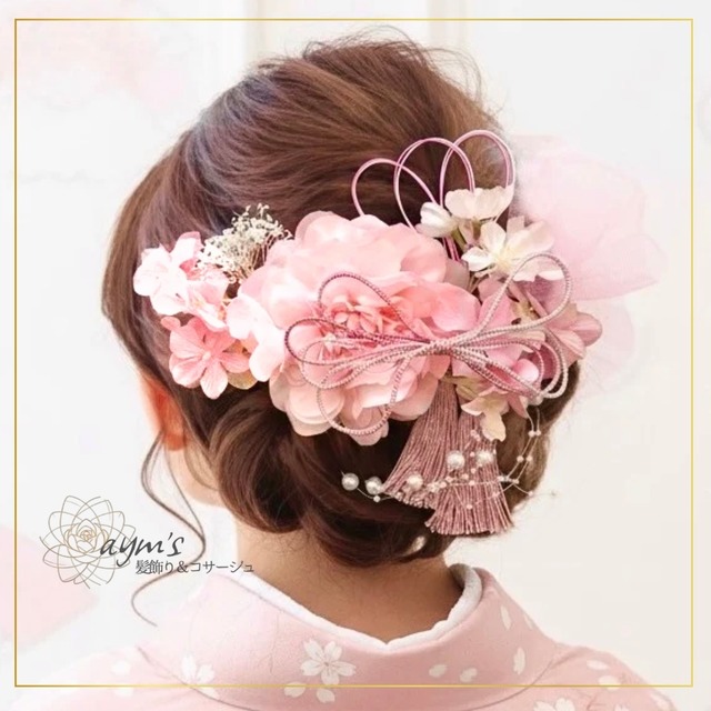 aym’s|髪飾り&コサージュ 販売実績25,000点以上 一生に一度の大切な日、 あなたの“晴れ姿”をより一層美しく。 **桜ピンクのダリアと和小物**を組み合わせた、華やかさと上品さを兼ね備えた和装専用の髪飾りです。 成人式(振袖)や卒業式(袴)、結婚式、七五三など特別な日に ぴったりの華やかな髪飾りです。 成人式や卒業式におすすめのデザインです。 ────────────────────── 〜春〜桜の和装髪飾り〜 柔らかいピンクのダリアにピンクの小花、桜やかすみ草、組紐リボンや水引といった和小物がセットになった可愛らしい髪飾りです。 (1枚目画像をご参照ください) パーツ仕様: 一つひとつが独立したパーツになっていますので、髪量やお着物に合わせて、様々なアレンジが自在です。 (和装・洋装問わずご使用いただけます。) カラーオーダー対応: ダリア、小花、組紐リボン、タッセル、水引など、豊富な色からお好みでカラーをカスタマイズできます。 ────────────────────── 【セット内容(1枚目画像)】 この作品はすべて独立したパーツで構成されています。 ダリア(花径 約10cm):1本(ユーピン仕様) 小花(4輪):2本(ワイヤー仕様) 小花(2輪):2本(ワイヤー仕様) 桜(サクラ):5輪1本(ワイヤー仕様) ピンクチュール:1本(ワイヤー仕様) プリザーブドフラワーかすみ草:1本(ワイヤー仕様) パールシャワー:1本(ユーピン仕様) 組紐リボン:1本(ユーピン仕様) タッセル:1本(ユーピン仕様) 水引:1本(ワイヤー仕様) ※ピンクの小花は小花カラー⑤のピンクになります。 (ダリアのお花のお色味に近いカラーです) ────────────────────── 【金具と仕様について】 ダリア、パール、タッセル、組紐リボンは「ユーピン」仕様、 その他のパーツは曲げやすい「ワイヤー」仕様です。 オプションにて全てユーピン仕様への変更を承ります。 髪量が少ない場合やお子様の場合には通常の仕様をおすすめしております。 小さなお子様の場合には備考欄にその旨をご記載頂けましたら、ユーピンの長さを短く加工させて頂きます。 ────────────────────── 【カラーオーダー・カスタマイズ】 お好みでカラーやパーツを選べるカラーオーダーに対応しております。 主に造花(アーティフィシャルフラワー)を使用しておりますので、花びら落ちなども無く、長い期間品質を保つことができます。 カラーオーダーご希望の場合にはオプションよりカラーオーダーを1点ご選択の上、 ご注文手続きの際の備考欄にお好みのカラーをご記載下さい。 カラー変更1点のご選択で全パーツの変更が出来ます。 ────────────────────── 【素材】 アーティフィシャルフラワー (桜、サクラ、ダリア、紫陽花など) プリザーブドフラワー(かすみ草) (天然かすみ草は時間の経過とともに淡く変化する表情も魅力のひとつです) チュール、タッセル、水引、パール ────────────────────── 【取り扱い・保管について】 髪飾りのパーツは必ず根元を持って着脱してください。 強い力を加えたり、水濡れにはご注意ください。 <プリザーブドフラワーの注意点と保管> プリザーブドフラワーは非常にデリケートです。優しくお取り扱いください。 保管の際は、直射日光・高温多湿を避けた暗所、防湿を心がけてください。 ────────────────────── 【梱包について】 形崩れ防止のため、 クラフトボックスに丁寧に梱包し発送いたします。 (ラッピング例参照) ────────────────────── 【発送について】 ご入金確認後、3〜5日以内 に発送いたします。 ※お急ぎ対応あり(翌日発送確約 ¥1,000) 宅急便コンパクト(追跡あり)にて、 丁寧に梱包しお届けいたします。 ※お急ぎの場合にはオプションより 『翌日発送確約』をご選択のうえご注文ください。翌日に発送します。 ────────────────────── 【ご購入前にご確認ください】 ハンドメイド作品のため、色味や配置に個体差がございます。 お客様都合(イメージ違い等)による返品・交換は条件付きで対応しております。 詳細はプロフィールをご確認ください。 ────────────────────── 【ご相談について】 お顔の見えないお取引だからこそ、ご注文からお届けまで、誠実で丁寧な対応を心がけております。 ご質問やオーダーのご相談は、お気軽にお問い合わせください。 ────────────────────── 【検索用キーワード】 ヘッドドレス/髪飾り/ヘッドピース/ヘッドパーツ/成人式/卒業式/結婚式/七五三 振袖/袴/和装/和婚/色打掛/白無垢/前撮り/フォトウェディング 花嫁/ブライダルヘアアクセサリー/桜/サクラ/ピンク/浴衣 #成人式髪飾り #卒業式髪飾り #七五三髪飾り #振袖ヘア #袴ヘア #和装ヘアアレンジ