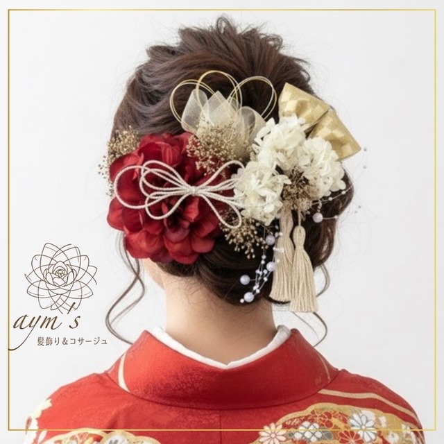 aym’s|髪飾り&コサージュ 販売実績 25,000点以上 人生の大切な節目である成人式や卒業式、結婚式を華やかに彩る 「赤ダリア×紫陽花」の和装髪飾りセットです。 凛とした赤と清楚な白のコントラストに、金糸を編み込んだタッセルや 伝統的な水引、組紐リボンを贅沢に組み合わせました。 振袖、袴、色打掛など、本格的な和装スタイルにふさわしい 気品と華やかさを演出します。 一点ずつ心を込めて、丁寧にお作りしております。 ────────────────────── 【作品の特徴】 ■ 自由自在なヘアアレンジ パーツはすべて独立した「Uピン」または「Iピン」仕様です。 まとめてボリュームを出したり、左右に散らしたりと、 ヘアスタイルに合わせて自由にアレンジをお楽しみいただけます。 ■ 高品質な素材を厳選 写真映えも美しい高品質なアーティフィシャルフラワーを採用。 かすみ草などの繊細なパーツにはプリザーブドフラワーを使用し、 本物の質感が高級感をプラスします。 ■ 充実のカラーオーダー お着物の柄に合わせて、各パーツの色変更が可能です。 あなただけの理想の組み合わせで、一生の思い出に残る装いを。 ────────────────────── 【セット内容】 ■ メインダリア(赤):1点 ■ 紫陽花小花:3点 ■ かすみ草(プリザーブドフラワー):4点 ■ タッセル:1点 ■ 水引飾り:1点 ■ 組紐リボン:1点 ■ シフォンリボン:2点 ■ パールシャワー:1点 ■ ラウンドパール:1点 ■ 市松ゴールドリボン:2点 ※詳細は掲載画像をご参照ください。 ────────────────────── 【カラーオーダーについて】 以下のパーツの色変更を承ります。 変更をご希望の場合は、オプションにて カラーオーダーをご選択のうえ、 ご購入時の【備考欄】にご希望の色味をご記入ください。 1. ダリア 2. 組紐リボン 3. 水引 4. タッセル 「この着物に合う色を相談したい」 といったご要望も大歓迎です! ────────────────────── 【ラッピングについて】 ■ 窓付きクラフトボックスラッピング 中身が見えるお洒落な窓付きのクラフトボックスに入れ、リボンを掛けてお届けいたします。 そのままギフトとしてお渡しいただけるほか、使用後の保管用ケースとしても重宝します。 ────────────────────── 【発送・納期について】 ■ 納期:ご入金確認後、3〜5日以内に発送いたします。 ■ お急ぎ対応:翌日発送確約(+1,000円)をオプションより選択可能です。 宅急便コンパクト(追跡あり)にてお届けいたします。 ────────────────────── 【ご購入の際の注意点】 ■ ハンドメイド作品のため、お花の配置や形にわずかな個体差がございます。 ■ 安心の交換・返品対応も行っております。詳細はプロフィール欄をご確認ください。 ────────────────────── 【検索用キーワード】 髪飾り/和装/成人式/卒業式/結婚式/前撮り/振袖/袴/色打掛/白無垢/ダリア/赤/紫陽花/かすみ草/水引/組紐/タッセル/カラーオーダー/ハンドメイド