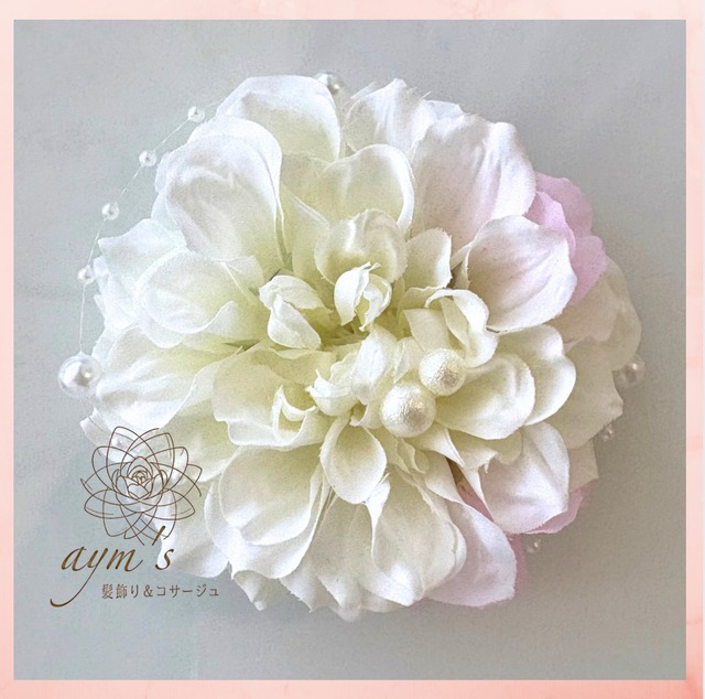aym’s|髪飾り&コサージュ 販売実績25,000点以上 卒業式・入学式、卒園式・入園式など、 大切な節目の日の胸元を、清らかなホワイトダリアと桜で華やかに彩るコサージュです。 春の式典にぴったりの、優しく上品な雰囲気。 ホワイトのダリアと繊細な桜(サクラ)を添え、 ハレの日にふさわしい晴れやかさと品格を両立させています。 一点ずつ丁寧にお作りしており、 心に残る記念日をより一層美しく演出します。 ────────────────────── 【ホワイトダリア&桜コサージュ】の特徴 2WAY仕様: クリップピン+安全ピン付きで、コサージュとしてはもちろん、髪飾りとしても使える汎用性の高いデザインです。 式典フォーマル向け: ダリアの花径は約10cmで、スーツやワンピースに美しく映える上品なサイズ感です。 春の限定デザイン: 桜のモチーフを添え、卒業・入学シーズンに最適な華やかさと季節感をプラスしました。 用途多彩: 各種式典の他、結婚式、七五三、発表会などにもご使用いただけます。 白、ベージュ、ネイビー、黒など、どんな色のスーツにも美しく調和し、 母としての装いや、先生・来賓の方にも安心してお使いいただけるコサージュです。 ────────────────────── 【カラーについて】 こちらの作品はホワイトを基調としていますが、 メインのダリアはクリームホワイトやアンティークベージュ、ラベンダークリームへのカラーの変更も可能です。 ご希望のカラーは、ご購入時の【備考欄】にご記入ください。 ────────────────────── 【仕様】 ダリアサイズ:花径 約10cm 金具:クリップピン+安全ピンの2way仕様 (お洋服を傷めにくく、安定して装着できます) ────────────────────── 【素材】 アーティフィシャルフラワー(ダリア、桜) パール、 型崩れしにくく、 繰り返しご使用いただける高品質な素材を使用しています。 ────────────────────── 【取り扱い・保管について】 着脱の際は必ず金具部分をお持ちください 強い力を加えたり、水濡れにはご注意ください 直射日光・高温多湿を避けて保管してください ────────────────────── 【梱包について】 形崩れ防止のため、 クラフトボックスに丁寧に梱包し発送いたします。 (ラッピング例参照) ────────────────────── 【発送について】 ご入金確認後、3〜5日以内 に発送いたします。 ※お急ぎ対応あり(翌日発送確約 ¥1,000) 宅急便コンパクト(追跡あり)にて、 丁寧に梱包しお届けいたします。 ※お急ぎの場合にはオプションより 『翌日発送確約』をご選択のうえご注文ください。翌日に発送します。 ────────────────────── 【ご購入前にご確認ください】 ハンドメイド作品のため、色味や配置に個体差がございます。 お客様都合(イメージ違い等)による返品・交換は条件付きで対応しております。 詳細はプロフィールをご確認ください。 ────────────────────── 【ご相談について】 お顔の見えないお取引だからこそ、ご注文からお届けまで、誠実で丁寧な対応を心がけております。 お洋服や式典の雰囲気に合わせたカラー選びのご相談も承っております。 ご不安な点がございましたら、ご購入前にお気軽にお問い合わせください。 ────────────────────── 【検索用キーワード】 コサージュ/セレモニー/卒業式/卒園式/入学式/入園式/結婚式 フォーマル/式典/ママコーデ/ホワイト/白/ダリア/桜/サクラ/2way