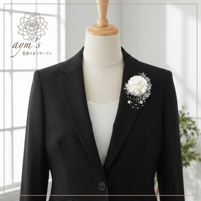 aym’s|髪飾り&コサージュ 販売実績25,000点以上。 卒業式・卒園式・入学式・結婚式など、 大切な節目の日に選ばれている上品なセレモニーコサージュです。 主張しすぎない小ぶりで上品なサイズ感のため、 お母様・先生・来賓の方にも安心してお使いいただけます。 フォーマルな装いに自然になじみ、 写真に残っても品よく美しい印象を与えてくれるデザインです。 ────────────────────── こんな方におすすめ ・卒業式・卒園式に着用するコサージュをお探しの方 ・華やかすぎず、きちんと感を大切にしたい方 ・母・先生として安心して使えるデザインをお求めの方 ・ブラック・ネイビーなどフォーマル服に合わせたい方 ────────────────────── デザインについて 中心には立体感のあるフラワーを配置し、 パールとかすみ草でやさしい華やかさを添えています。 ・小さめサイズで上品 ・顔まわりを明るく見せるバランス ・写真映えしつつ控えめな存在感 卒業式・卒園式だけでなく、 入学式・結婚式・フォーマルなお席にもお使いいただけます。 ────────────────────── ✽ カラーについて(選べる11色)✽ デザインはそのままに、 メインカラーをお選びいただけます。 ・ホワイト ・オフホワイト ・レッド ・エンジ ・桜ピンク ・ピンク ・パープル ・水色 ・ブルー ・オレンジ ・イエロー ※カラーは商品画像をご参照ください ※ご希望カラーは種類よりご選択ください。 ────────────────────── ✽ サイズ・仕様 ✽ ・全体サイズ:約7cm ・金具:クリップ&ブローチピン(2way仕様) コサージュとしてはもちろん、 バッグやストールへの着用も可能です。 ────────────────────── ✽ 素材 ✽ ・アーティフィシャルフラワー ・プリザーブドフラワーかすみ草 (時間の経過と共にベージュに変化します。 自然素材ならではの変化も合わせてお楽しみください) ・パール ・パールガーランド 型崩れしにくいため 式典当日も安心してご使用いただけます。 ────────────────────── 【お揃いの親子ペアコサージュ】 ¥2780- オプションにてお揃いの親子ペアコサージュを ご用意しております。 ダリア花径約10cmのお母様向けコサージュです。 大切な晴れの日にお揃いのコサージュを。 お母様コサージュ対応カラー ・ホワイト ・ベージュ ・ピンク ・チェリーピンク ・ローズピンク ・パープル ・ブルー ・ブラック ・イエロー ・オレンジ ・グリーン ・レッド ────────────────────── 【発送・ラッピング】 ・通常発送:3〜5日以内 ・宅急便コンパクト(追跡あり) ・丁寧にラッピングしてお届けします (※画像はラッピングサンプルです) ────────────────────── 【ご購入前にご確認ください】 ・ハンドメイド作品のため、配置や形に若干の個体差があります ・画面環境により色味が異なって見える場合がございます ・イメージ違いによる返品・交換は条件付き対応となります 詳細はプロフィールをご確認ください。 ────────────────────── 【ご相談について】 服装や年代、式典内容に合わせた カラー選びのご相談も承っております。 ご不安な点はご購入前にお気軽にお問い合わせください。 ────────────────────── 卒業式/卒園式/入学式/母コーデ/先生コーデ/フォーマル コサージュ/セレモニーコサージュ/小ぶりコサージュ ヘアアクセサリー/ブローチ/2wayコサージュ
