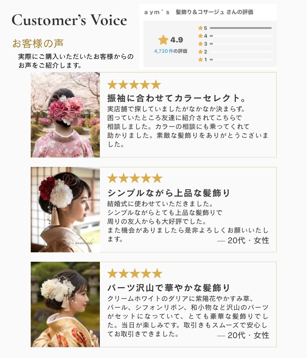 aym's|髪飾り&コサージュ 販売実績25,000点以上|成人式・卒業式・結婚式に選ばれてきた上品な和装髪飾り 和装に美しく映えることを大切に、 和装専用の髪飾りを一点ずつ丁寧にお作りしています。 一生に一度の大切な日が、 より美しく、心に残る一日となりますように。 aym’sでは、 晴れの日の装いを引き立てる 和装専用の髪飾りを 一点一点心を込めてお届けしています。 ────────────────────── ・和装に映える色合わせと立体感 ・華やかすぎず、写真映えする上品な仕上がり ・前撮り・当日どちらにも使いやすいデザイン ・美容師様にも扱いやすい独立パーツ仕様 「品の良さ」と「晴れの日らしさ」を大切に しております。 ────────────────────── 桜ピンクの和装花髪飾り 愛らしい桜ピンクの花びらが特徴の、 華やかさと上品さを兼ね備えた髪飾りです。 結婚式、成人式、卒業式など、 特別な日を彩るのにぴったりなアイテムです。 ひとつひとつがパーツになっております ので、季節を問わず結婚式や成人式、 卒業式や七五三など様々なシーンで ご着用頂けます。 追加やカラー変更のない場合は 1枚目画像のセットでのお届けとなります。 ────────────────────── ✽ カラーオーダーについて ✽ 下記のパーツはカラーオーダー対象です。 (✽セット内容✽の★印のもの) ・ダリア ・小花 ・組紐リボン ・水引 ・タッセル お好みに合わせて あなただけの配色にカスタマイズしていただけます。 ご希望の際はオプションよりカラーオーダー をご選択の上、ご購入時の【備考欄】または 【お問い合わせ】よりご希望カラーをご指定ください。 ※カラー変更は¥300で複数変更可能。 ────────────────────── 〜春爛漫桜の髪飾り〜 桜の上品な和装髪飾りセット(数量限定) 1枚目の画像に写っているものが “全てセット内容” となります。 淡い桜色を基調に、ダリア・桜・小花をふんだんに使用した、春の装いにぴったりの和装ヘッドパーツです。 成人式・卒業式・結婚式などフォーマルシーンにも映える、気品ある華やかさが特徴です。 ────────────────────── ✽セット内容✽ ・ダリア(花径約10cm)……1本/Uピン★ ・小花 1輪×6本……ワイヤー仕様★ ・小花2輪×3本……ワイヤー仕様★ ・桜 5輪×1本……ワイヤー仕様 ・桜大1輪×3本……ワイヤー仕様 ・プリザーブドフラワーかすみ草……1本/ワイヤー仕様 ・パールシャワー……1本/Uピン ・組紐リボン……1本/Uピン★ ・タッセル……1本/Uピン★ ・水引……1本/ワイヤー仕様★ ・チュールレース……1本/ワイヤー仕様 ※オプションにて 全てUピン仕様へ変更可能。 プリザーブドフラワーのかすみ草以外は 丈夫なアーティフィシャルフラワーを使用 しておりますので、品質を損なわず長い期間 状態を保つことができます。 前撮りから本番までご活用下さい。 ────────────────────── ✽ ダリア対応カラー ✽ ホワイト/ベージュ/ピンク/チェリーピンク ローズピンク/パープル/ブルー/ブラック イエロー/オレンジ/グリーン/レッド ✽ 小花対応カラー ✽ ホワイト/ベージュ/イエロー 淡いピンク/ピンク/パープル/濃いパープル 濃いブルー/ブルー/ネイビー 淡いグリーン/ライムグリーン 他、カラーサンプル画像参照ください。 ────────────────────── 【素材 】 ・ダリア・桜・小花: アーティフィシャルフラワー ・紫陽花/かすみ草:プリザーブドフラワー (ドライフラワー) ・水引 ・タッセル ・組紐 ・パールガーランド ───────────────────── 【取り扱いについて】 ・一つ一つ丁寧に制作したハンドメイド作品です ・強い力を加えたり、水濡れにはご注意ください ・直射日光・高温多湿を避けて保管してください ───────────────────── 【発送について】 ご入金確認後、【3〜5日以内】に発送いたします。 宅急便コンパクト(追跡あり)にて、丁寧に梱包しお届けします。 ───────────────────── 【お支払い方法】 クレジットカード/コンビニ決済/PayPal/キャリア決済/銀行振込 ※詳細はご購入手続き画面にてご確認ください。 ───────────────────── 【お急ぎのお客様へ】 お急ぎ対応(翌日発送確約)をご用意しております。 ※必ずご購入前にオプション内容をご確認ください。 ご使用日がお決まりの場合は、ご購入前にお問い合わせください。 ───────────────────── 【写真について】 商品画像は、できる限り実物に近い色味になるよう 自然光・室内光の両方で撮影しておりますが、 ご覧いただく環境(スマートフォン・PC画面)により 色味の見え方に多少の差が生じる場合がございます。 ───────────────────── 【美容師様にも扱いやすい仕様】 すべて独立したUピン・