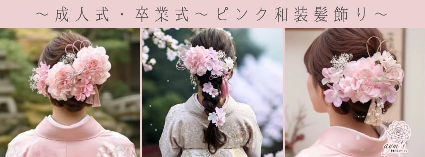 aym's|髪飾り&コサージュ 販売実績25,000点以上|成人式・卒業式・結婚式に選ばれてきた上品な和装髪飾り 和装に美しく映えることを大切に、 和装専用の髪飾りを一点ずつ丁寧にお作りしています。 一生に一度の大切な日が、 より美しく、心に残る一日となりますように。 aym’sでは、 晴れの日の装いを引き立てる 和装専用の髪飾りを 一点一点心を込めてお届けしています。 ────────────────────── ・和装に映える色合わせと立体感 ・華やかすぎず、写真映えする上品な仕上がり ・前撮り・当日どちらにも使いやすいデザイン ・美容師様にも扱いやすい独立パーツ仕様 「品の良さ」と「晴れの日らしさ」を大切に しております。 ────────────────────── 桜ピンクの和装花髪飾り 愛らしい桜ピンクの花びらが特徴の、 華やかさと上品さを兼ね備えた髪飾りです。 結婚式、成人式、卒業式など、 特別な日を彩るのにぴったりなアイテムです。 ひとつひとつがパーツになっております ので、季節を問わず結婚式や成人式、 卒業式や七五三など様々なシーンで ご着用頂けます。 追加やカラー変更のない場合は 1枚目画像のセットでのお届けとなります。 ピンクの小花は小花カラー⑤のピンクに なります。 (ダリアのお花のお色味に近いカラー) ────────────────────── ✽ カラーオーダーについて ✽ 下記のパーツはカラーオーダー対象です。 (✽セット内容✽の★印のもの) ・ダリア ・小花 ・組紐リボン ・水引 ・タッセル お好みに合わせて あなただけの配色にカスタマイズしていただけます。 ご希望の際はオプションよりカラーオーダー をご選択の上、ご購入時の【備考欄】または 【お問い合わせ】よりご希望カラーをご指定ください。 ※カラー変更は¥300で複数変更可能。 ────────────────────── ✽セット内容✽ ダリア花径 約10cm 1本 ユーピン仕様★ 小花 4輪2本 2輪2本 ワイヤー仕様★ 桜サクラ 5輪1本 ワイヤー仕様 ピンクチュール1本 ワイヤー仕様 プリザーブドフラワーかすみ草 1本 ワイヤー仕様 パールシャワー1本 ユーピン仕様 組紐リボン1本 ユーピン仕様★ タッセル 1本 ユーピン仕様★ 水引 1本 ワイヤー仕様★ プリザーブドフラワーのかすみ草以外は 丈夫なアーティフィシャルフラワーを使用 しておりますので、品質を損なわず長い期間 状態を保つことができます。 前撮りから本番までご活用下さい。 ────────────────────── ✽ ダリア対応カラー ✽ ホワイト/ベージュ/ピンク/チェリーピンク ローズピンク/パープル/ブルー/ブラック イエロー/オレンジ/グリーン/レッド ✽ 小花対応カラー ✽ ホワイト/ベージュ/イエロー 淡いピンク/ピンク/パープル/濃いパープル 濃いブルー/ブルー/ネイビー 淡いグリーン/ライムグリーン 他、カラーサンプル画像参照ください。 ────────────────────── 【素材 】 ・ダリア・桜・小花: アーティフィシャルフラワー ・紫陽花/かすみ草:プリザーブドフラワー (ドライフラワー) ・水引 ・タッセル ・組紐 ・パールガーランド ───────────────────── 【取り扱いについて】 ・一つ一つ丁寧に制作したハンドメイド作品です ・強い力を加えたり、水濡れにはご注意ください ・直射日光・高温多湿を避けて保管してください ───────────────────── 【発送について】 ご入金確認後、【3〜5日以内】に発送いたします。 宅急便コンパクト(追跡あり)にて、丁寧に梱包しお届けします。 ───────────────────── 【お支払い方法】 クレジットカード/コンビニ決済/PayPal/キャリア決済/銀行振込 ※詳細はご購入手続き画面にてご確認ください。 ───────────────────── 【お急ぎのお客様へ】 お急ぎ対応(翌日発送確約)をご用意しております。 ※必ずご購入前にオプション内容をご確認ください。 ご使用日がお決まりの場合は、ご購入前にお問い合わせください。 ───────────────────── 【写真について】 商品画像は、できる限り実物に近い色味になるよう 自然光・室内光の両方で撮影しておりますが、 ご覧いただく環境(スマートフォン・PC画面)により 色味の見え方に多少の差が生じる場合がございます。 ───────────────────── 【美容師様にも扱いやすい仕様】 すべて独立したUピン・ストレートピン仕様のため、 美容師様にも扱いやすく、 ヘアセット時の微調整がしやすいデザインです。 ───────────────────── 【ご相談について】 衣装のお色味やご使用シーンに合わせた 配色のご相談も承っております。 ご不安な点がございましたら、 ご購入前にお気軽にお問い合わせください。 ───────────────────── ヘッドドレス/花嫁/成人式/着物/振袖/卒業式/ 