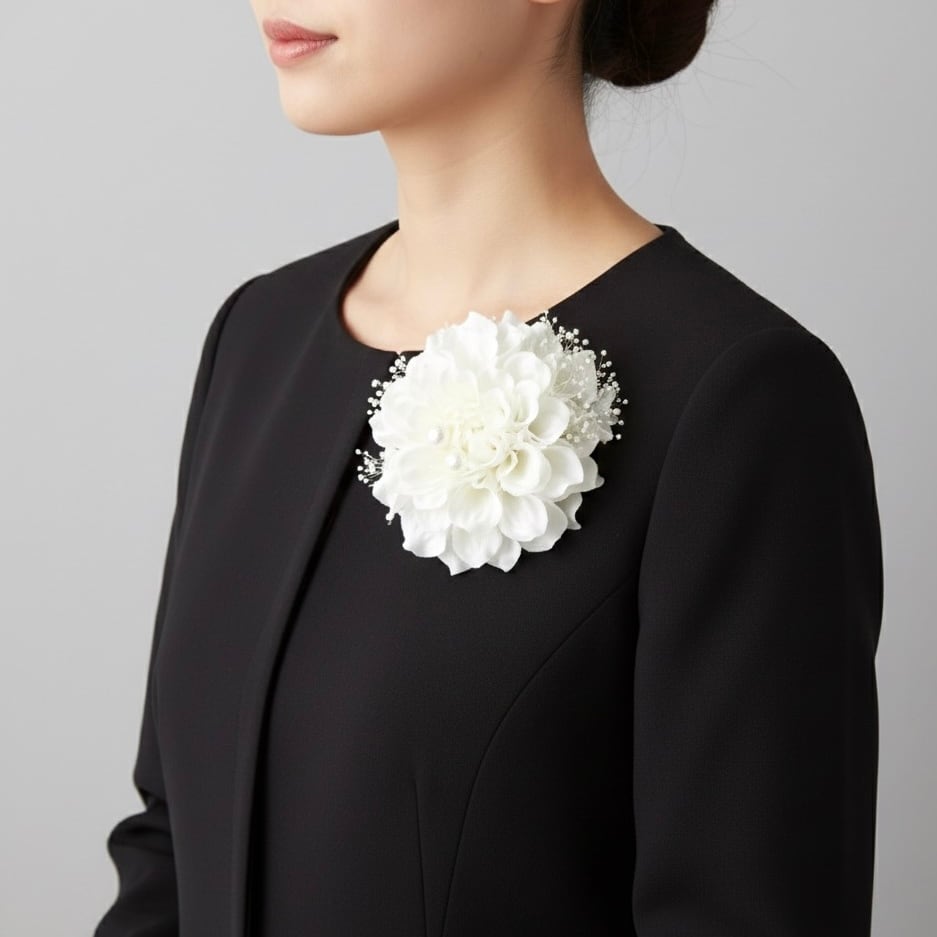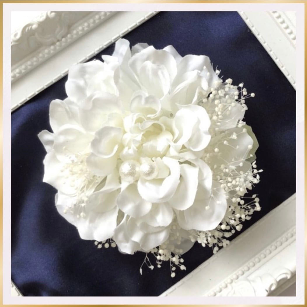 【卒業式・卒園式】白ダリアの上品なセレモニーコサージュ|パール&かすみ草デザイン|結婚式・入園式・卒園式 | aym's 髪飾り&コサージュ|成人式・卒業式・結婚式アクセサリー|ayms-shop.com
