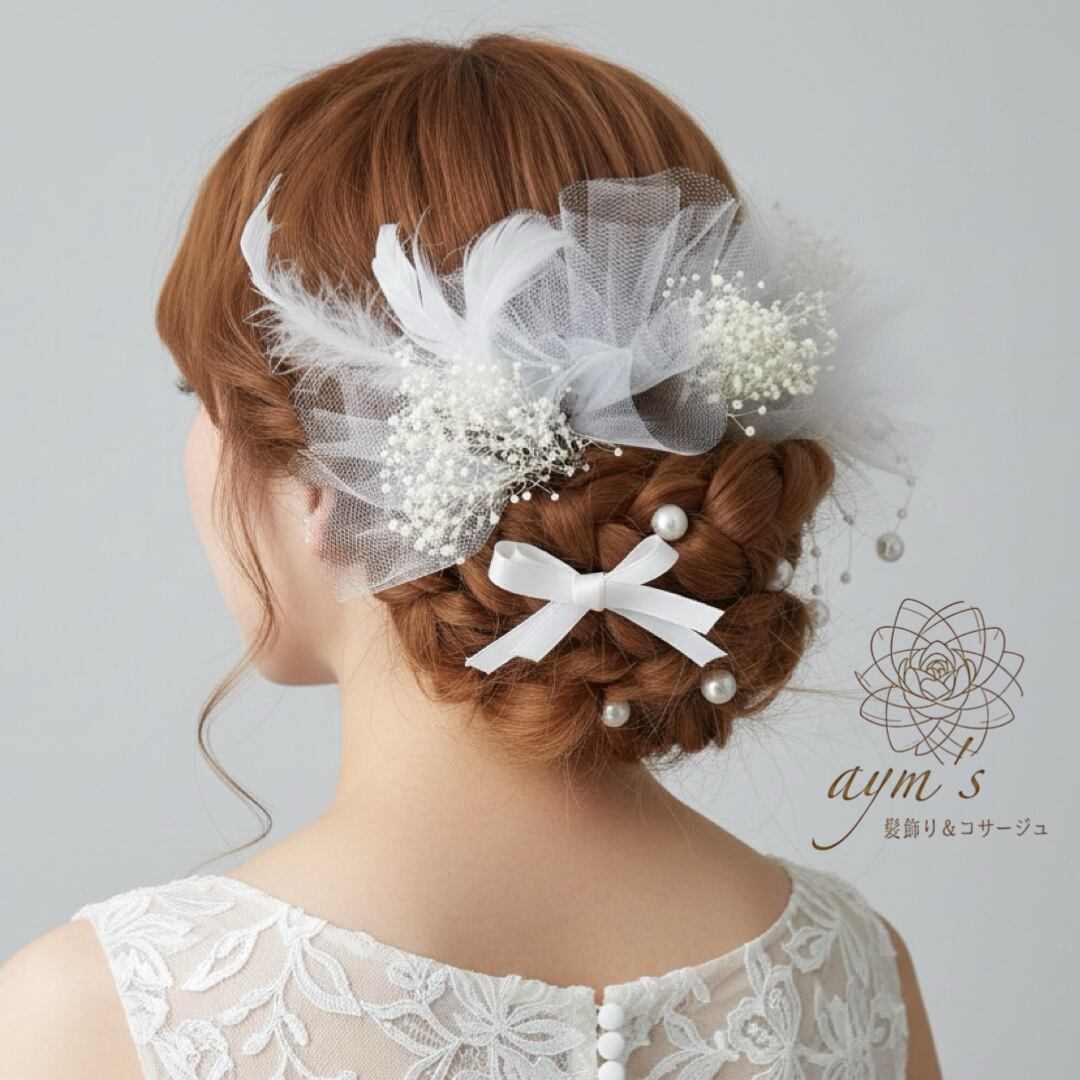 【純白フェザー&チュール】ヘッドドレス・髪飾り|ブライダル・前撮り・海外ウェディング|フェザー×チュールレース×かすみ草×パール