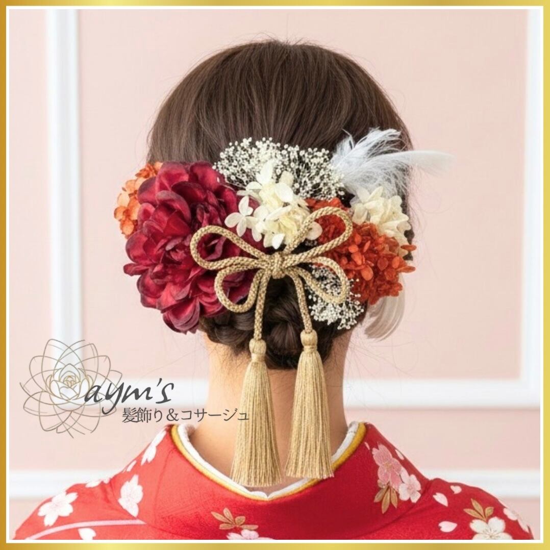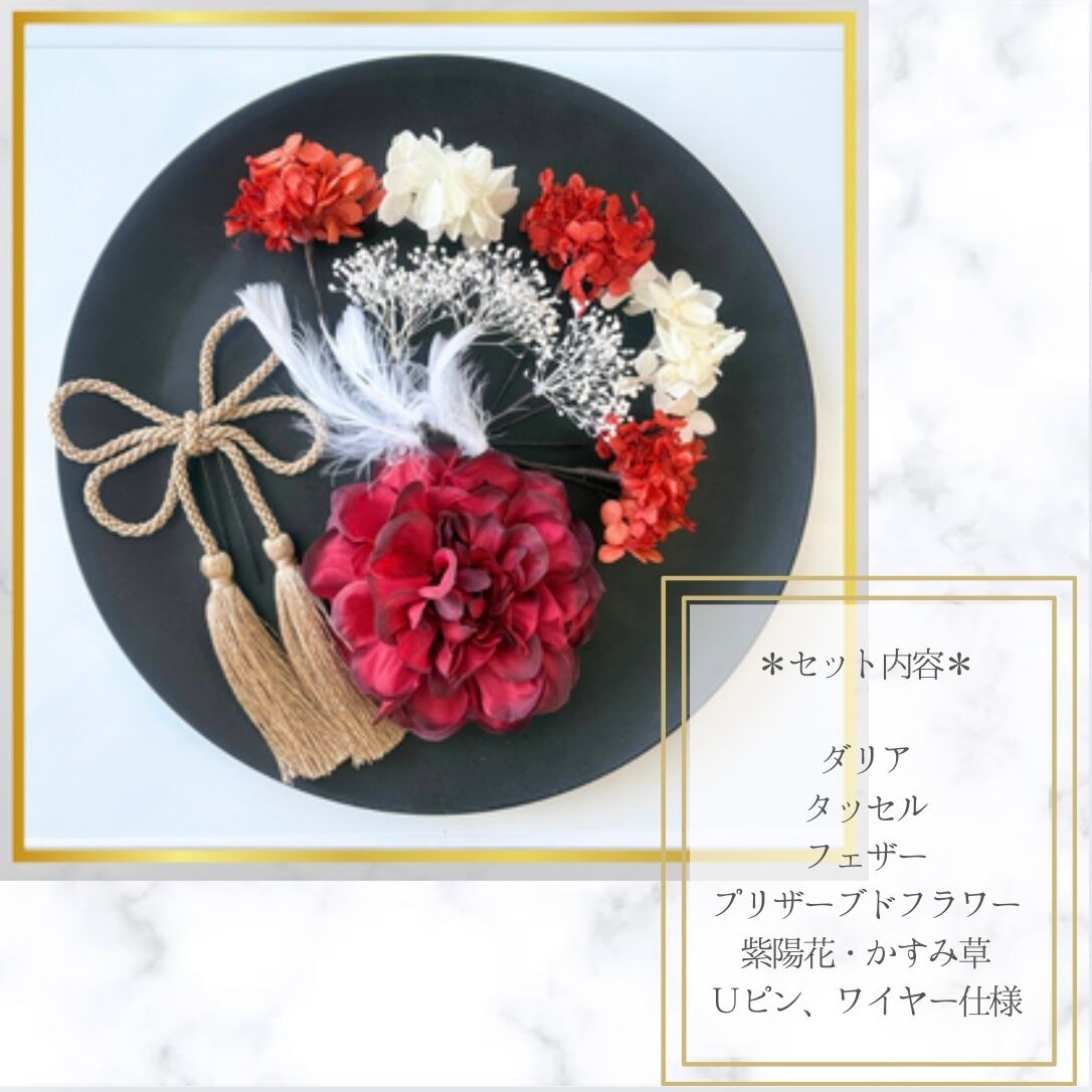 成人式・卒業式に選ばれる|レッド赤ダリア×ゴールドタッセル|和装髪飾りセット|カラーオーダー可(ダリアのみ) | aym's 髪飾り&コサージュ|成人式・卒業式・結婚式アクセサリー|ayms-shop.com