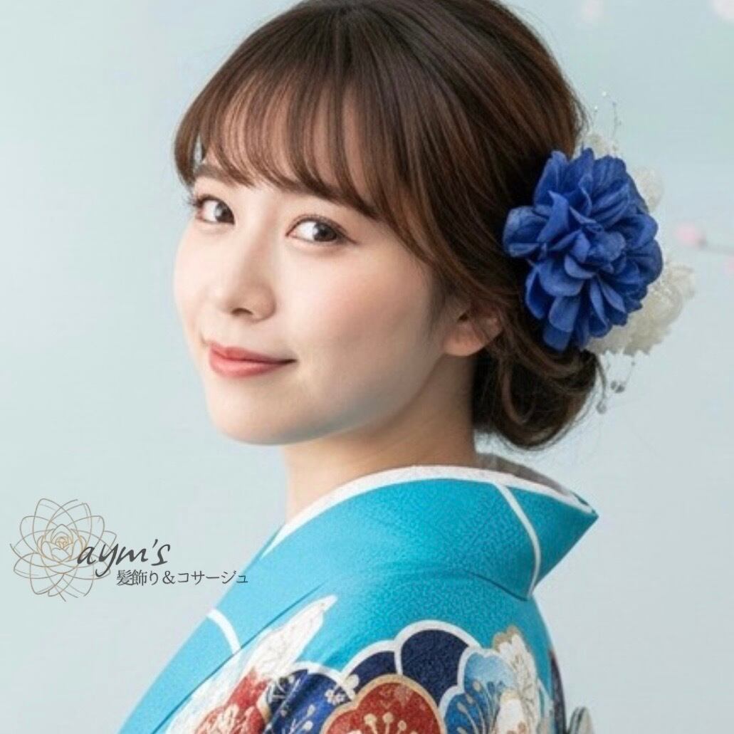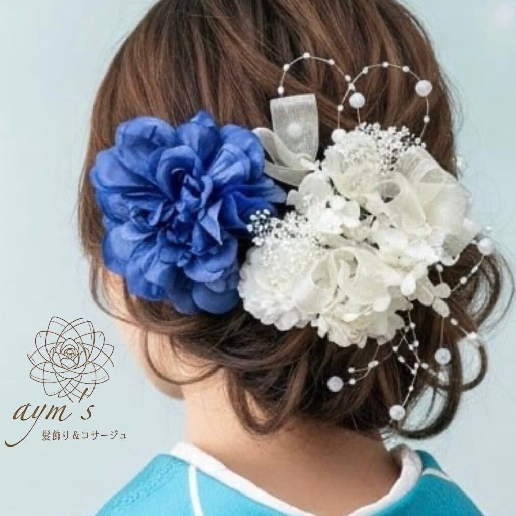 成人式・卒業式に選ばれる|ブルー(青)ダリア×プリザーブドフラワー紫陽花×パール|和装・洋装髪飾りセット|カラーオーダー可(ダリア・マム) | aym's 髪飾り&コサージュ|成人式・卒業式・結婚式アクセサリー|ayms-shop.com