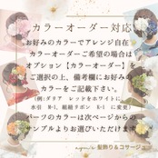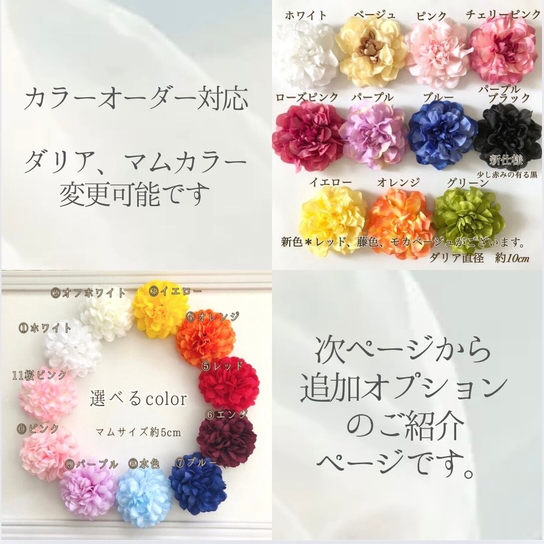 メインのダリアとマムはお好みの色に変更可能。お着物の柄や雰囲気にぴったりの「自分色」にカスタマイズいただけます。