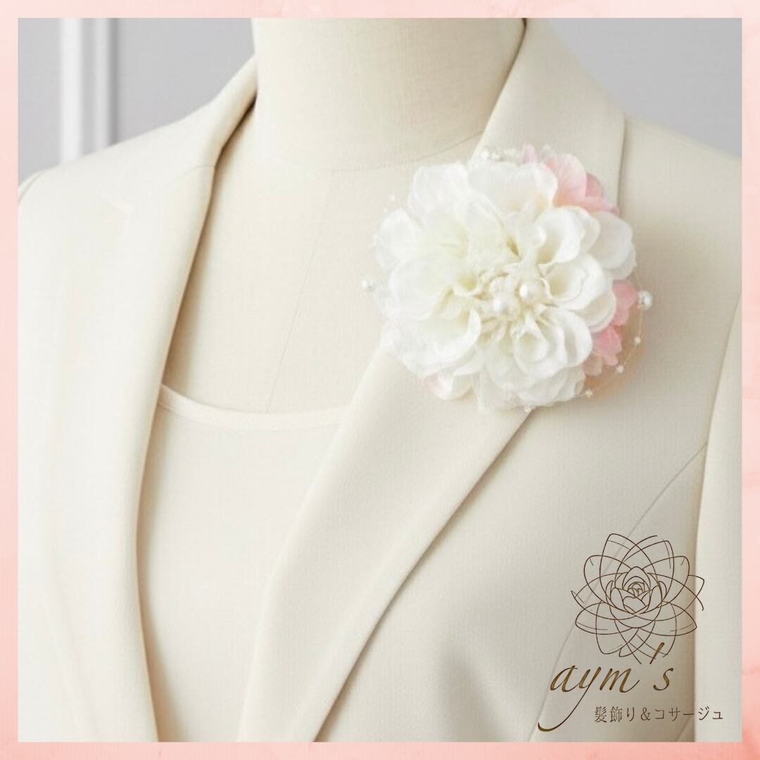 【卒業式・入学式・入園式】ホワイトダリア&桜の2wayセレモニーコサージュ|卒園式・結婚式・式典・髪飾りにも | aym's 髪飾り&コサージュ|成人式・卒業式・結婚式アクセサリー|ayms-shop.com
