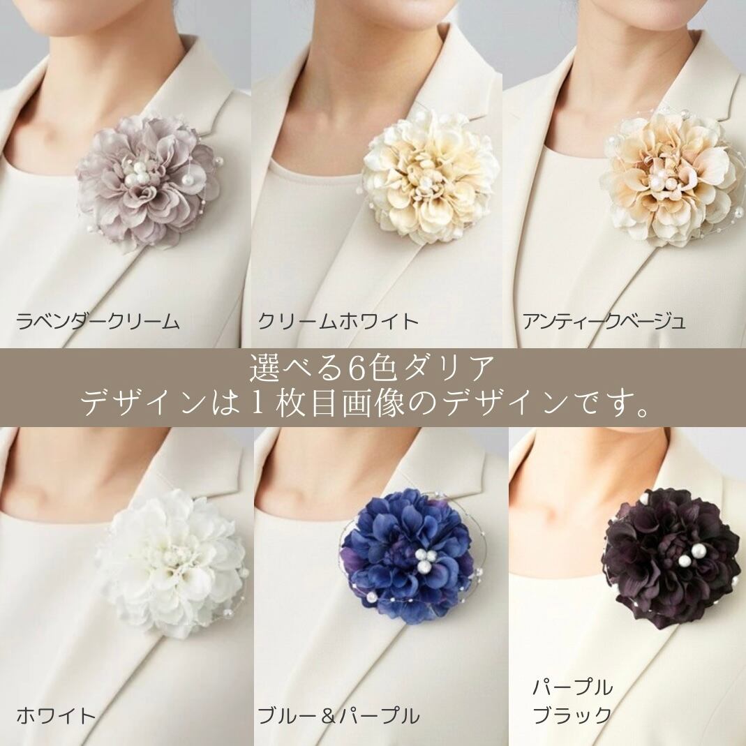 ダリアの花径は約10cmで、スーツやワンピースに美しく映える上品なサイズ感です。