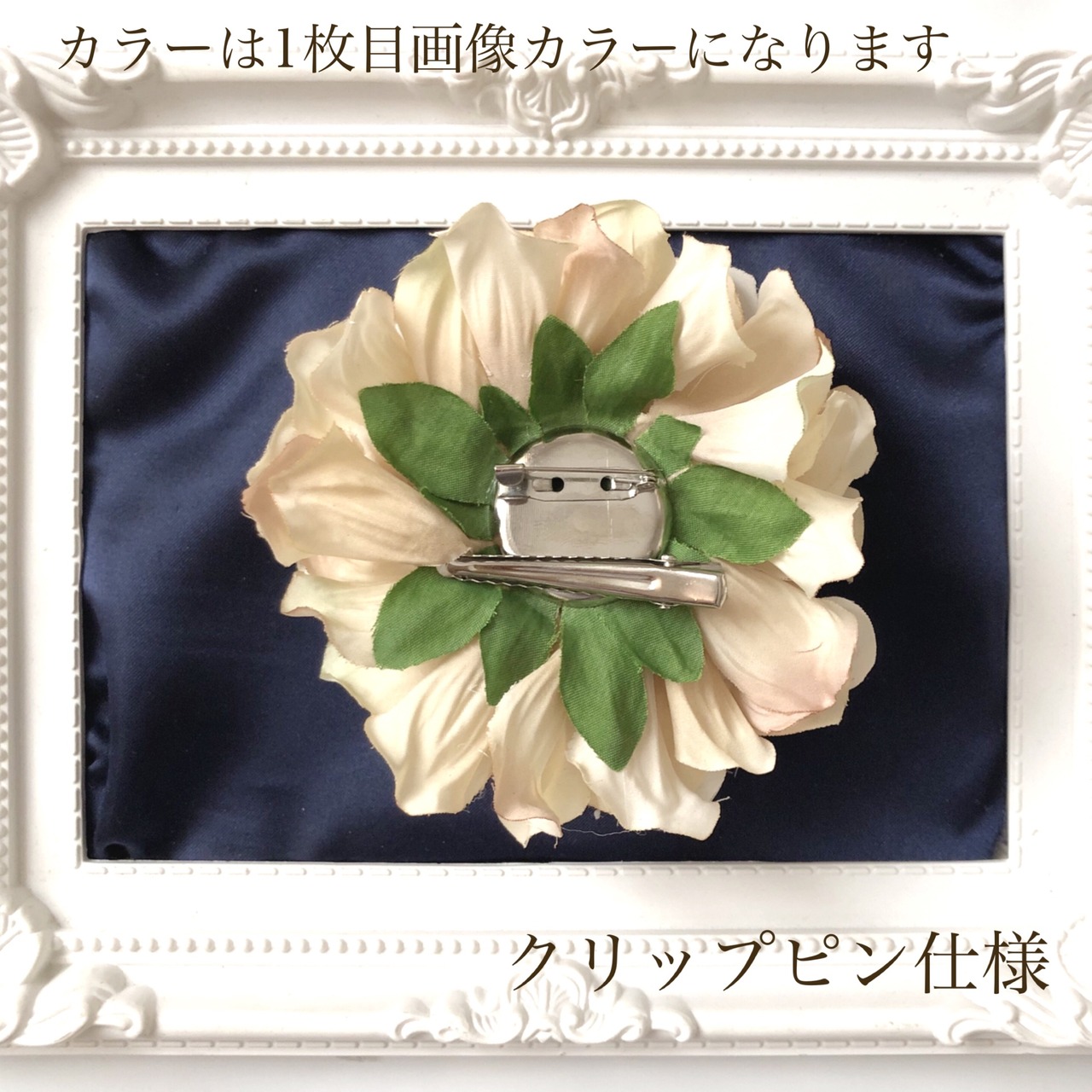 クリップピン+安全ピン付きで、コサージュとしてはもちろん、髪飾りとしても使える汎用性の高いデザインです。