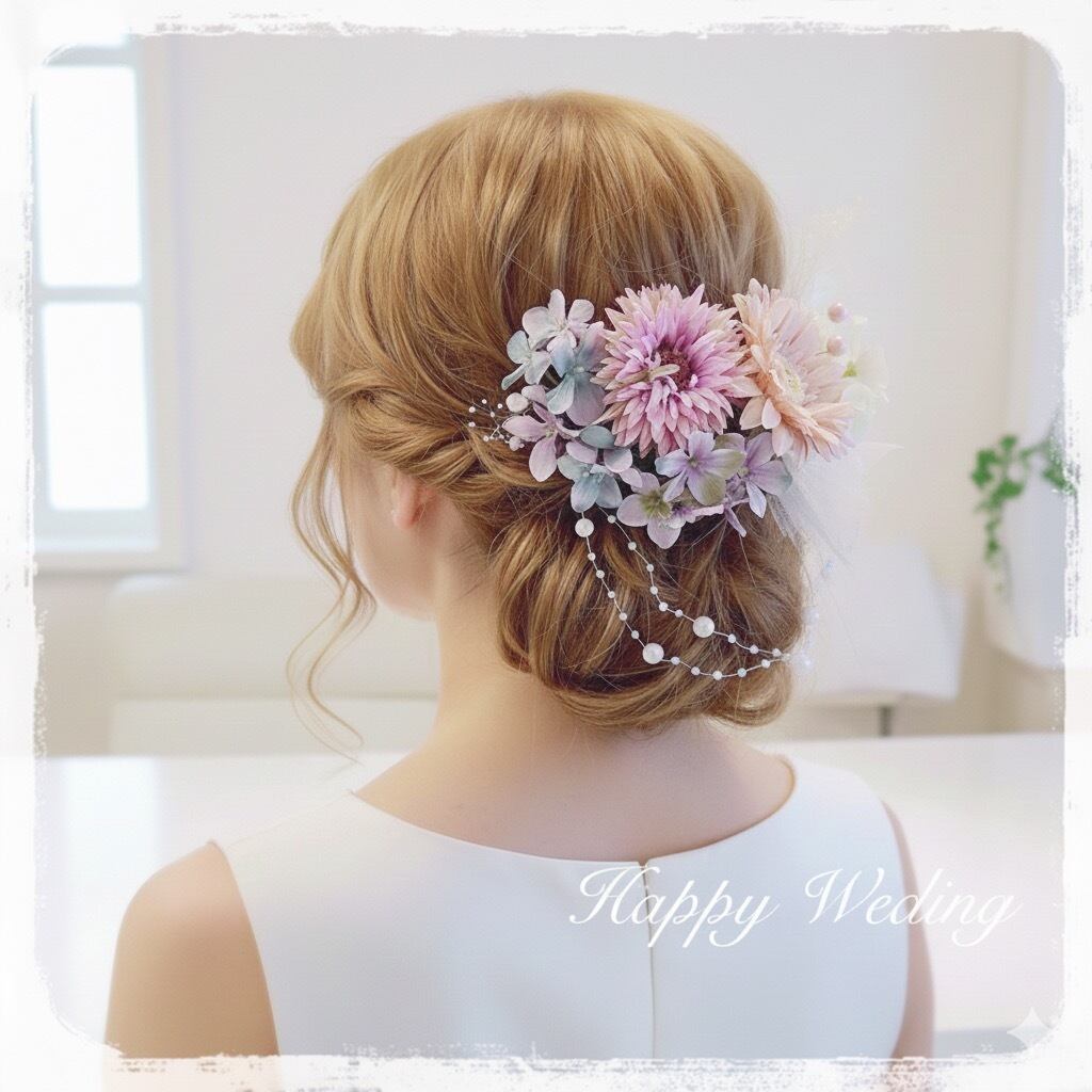 【結婚式・成人式】くすみカラー|ふんわりチュールとパールが可憐なフラワーヘッドドレス